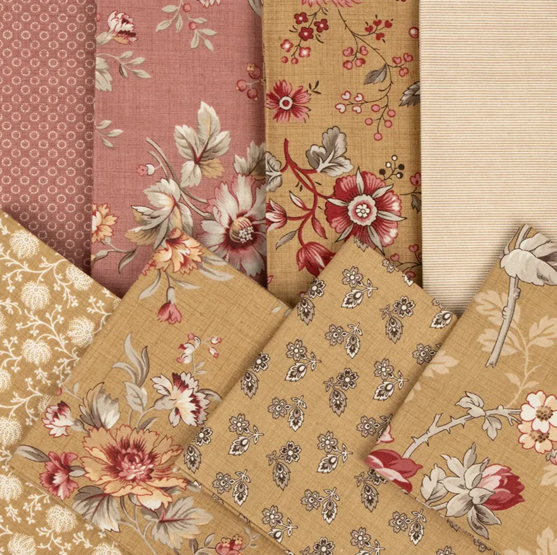 深いフレンチレッド、グレージュ、クリーム、ローズカラーなど、落ち着いた配色が特徴。