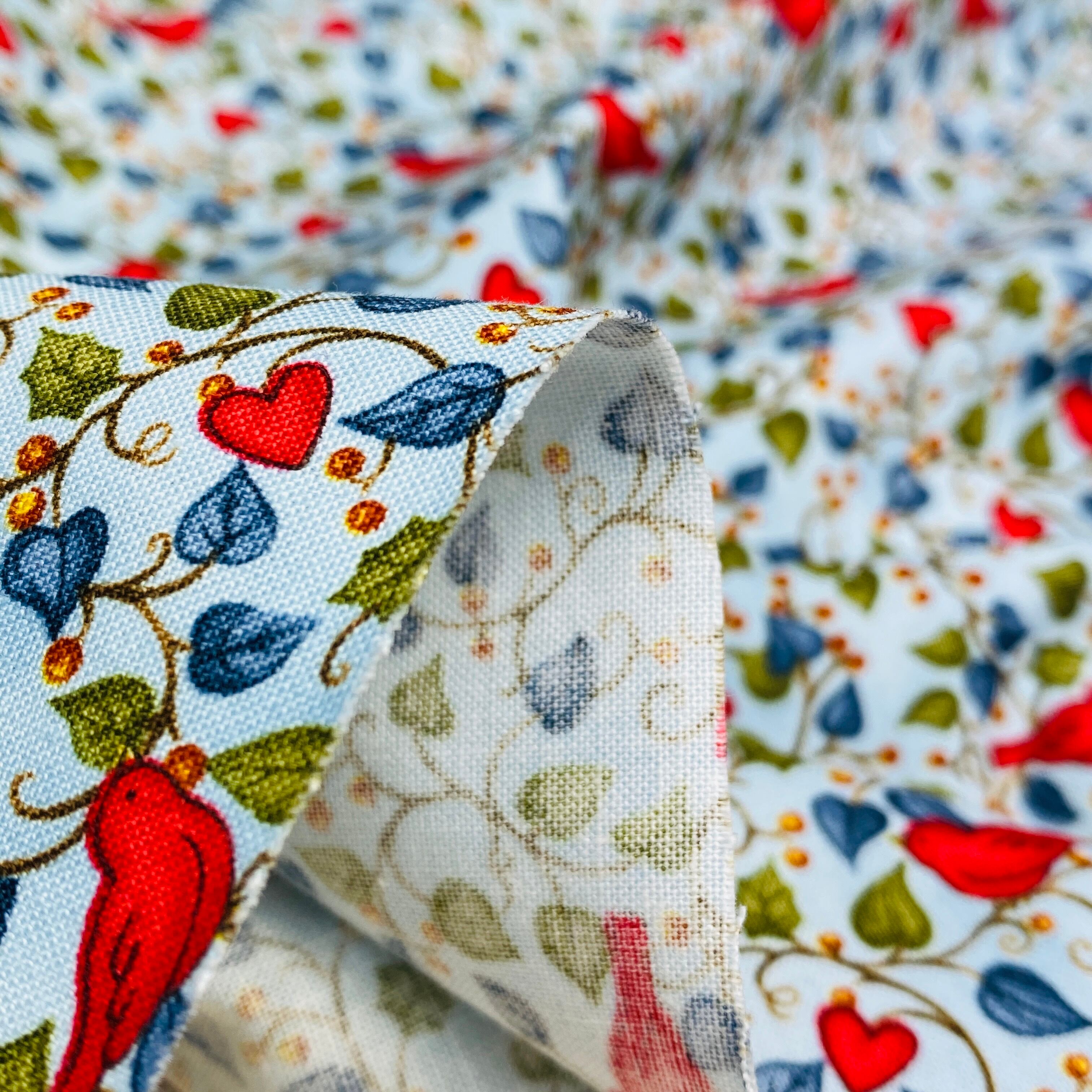カントリー風の水色地に赤い鳥とハートがかわいいデザインです