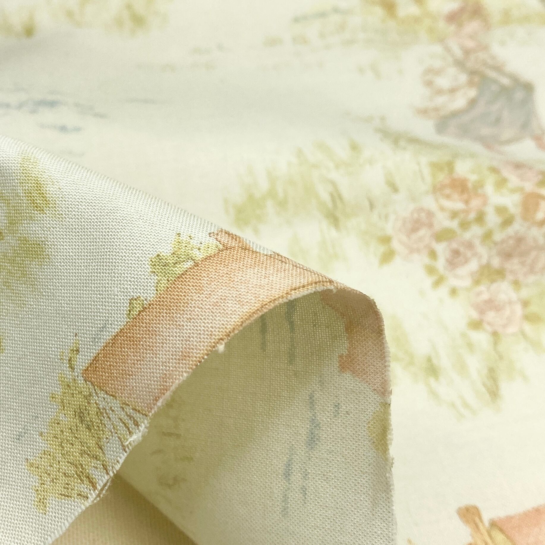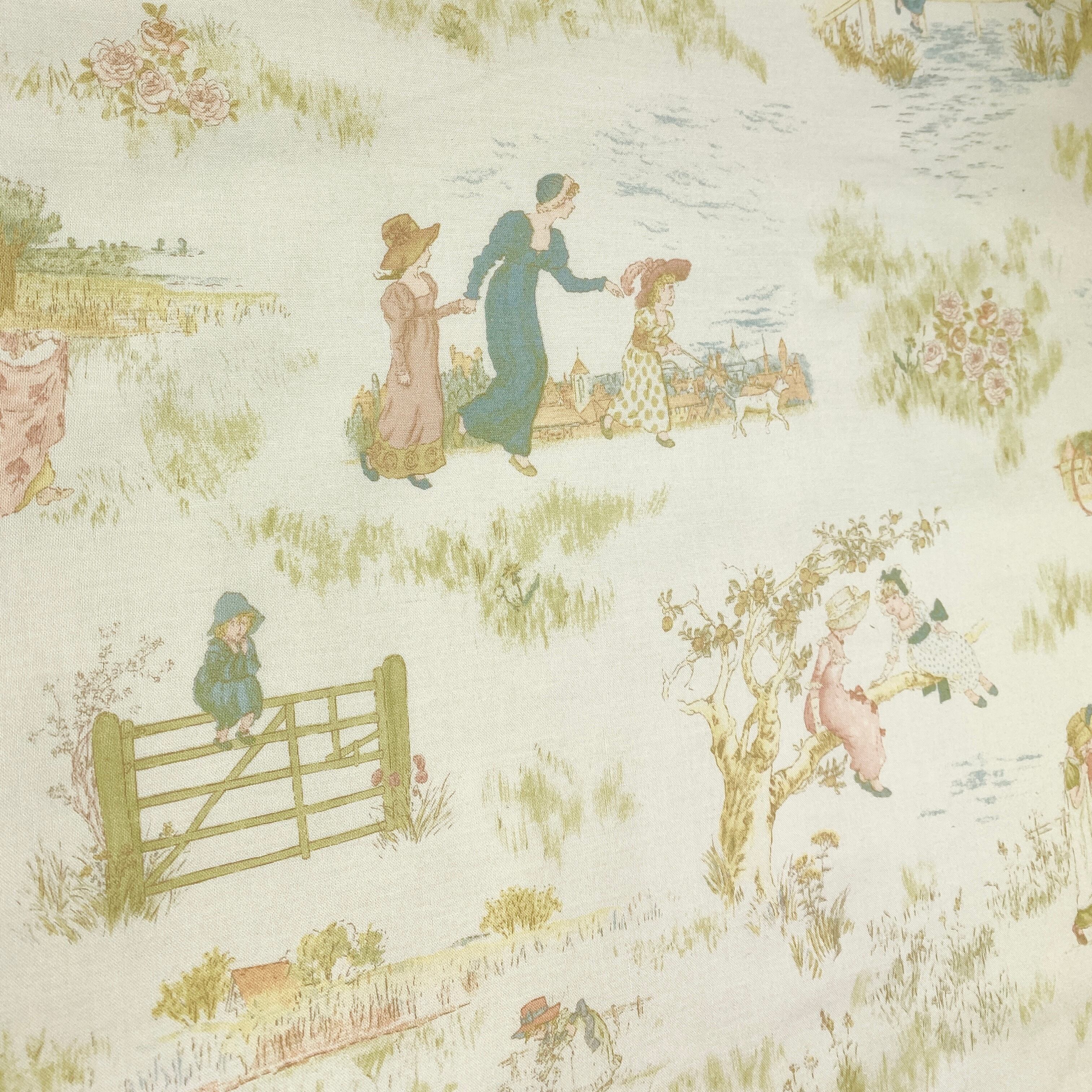 ケイトグリナウェイの挿絵をルシアンが版権を得て再現した布です。淡い落ち着いたグレーブルーのような地に優しい色合いの挿絵がデザインされてます。